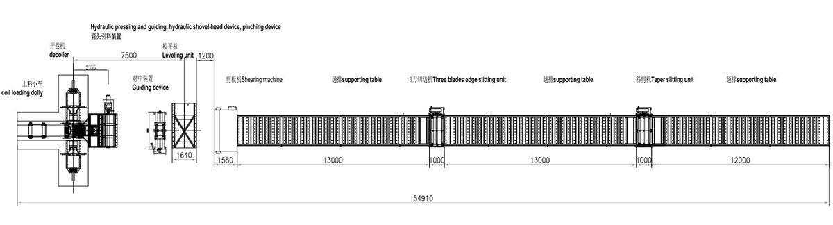 应用:用于路灯杆材料的开卷,校平,剪切,梯形板斜剪,以获得一头大以头小的路灯杆板材